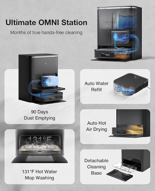 - Ultimate Hands-Free Cleaning: ECOVACS OMNI station offers a fully automated solution. It self-empties with a large dust bag that holds up to 90 days of dust, while also washing wipes with 131°F hot water to ensure cleanliness. Additionally, it refills the robot's built-in water tank with clean water to cover up to 4300 sqft (400 sqm) and uses hot air to dry the mop after each use, preventing unpleasant odors.